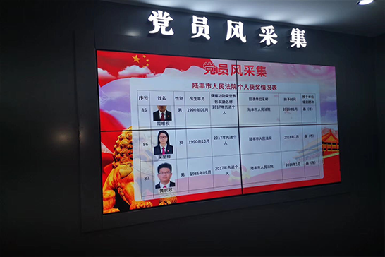 目前陆丰法院响应国家政策号召坚持“公开化、透明化”的办公要求,对内部职能员工进行展示,方便群众监督的同时也加强内部责任建设。本次鼎深科技围绕陆丰法院的拼接屏系统已正式投入使用,主要围绕着公开化、透明化的原则进行展示,系统后台具有自动更新的功能,支持自定义背景图片和相关功能,操作更便捷。
