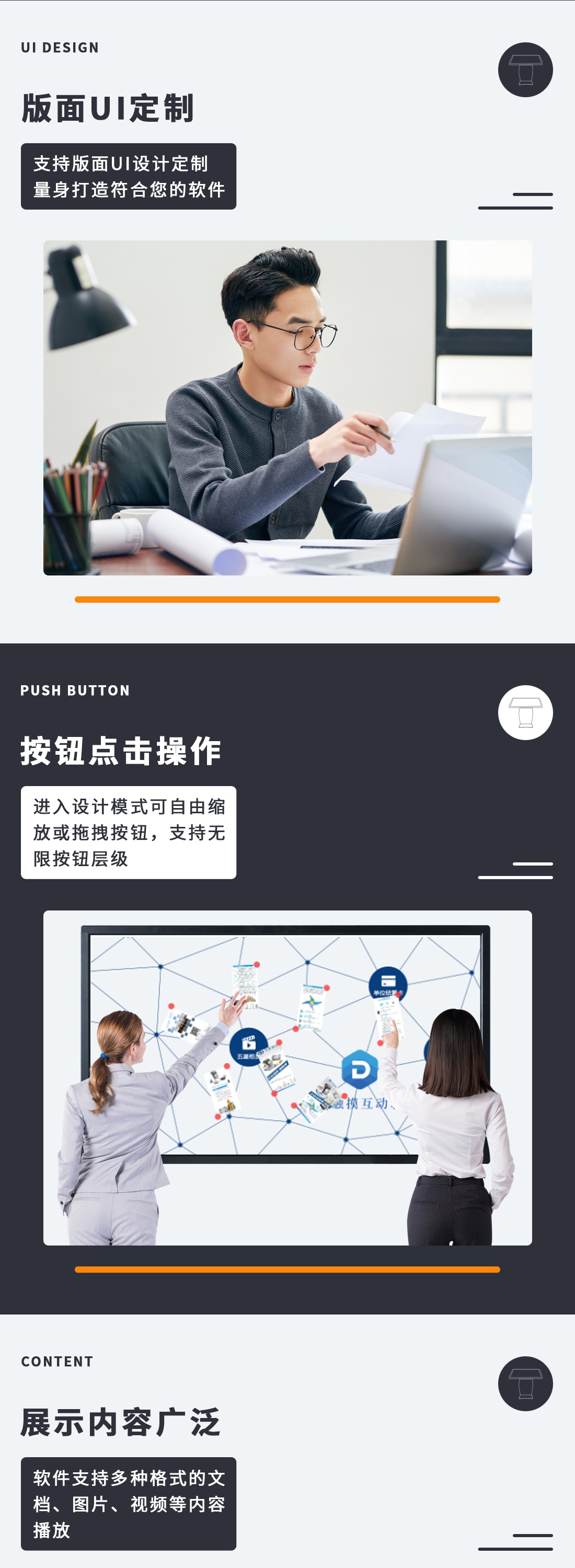 *支持高性能的文件交互:通过双手的自由操作,文档、高清图片、视频的快速呈现和多点交互,如放大、缩小、旋转、拖拽、也可将滑动图片或视频到显示器边缘,把需要讲解的内容展示在用户面前。