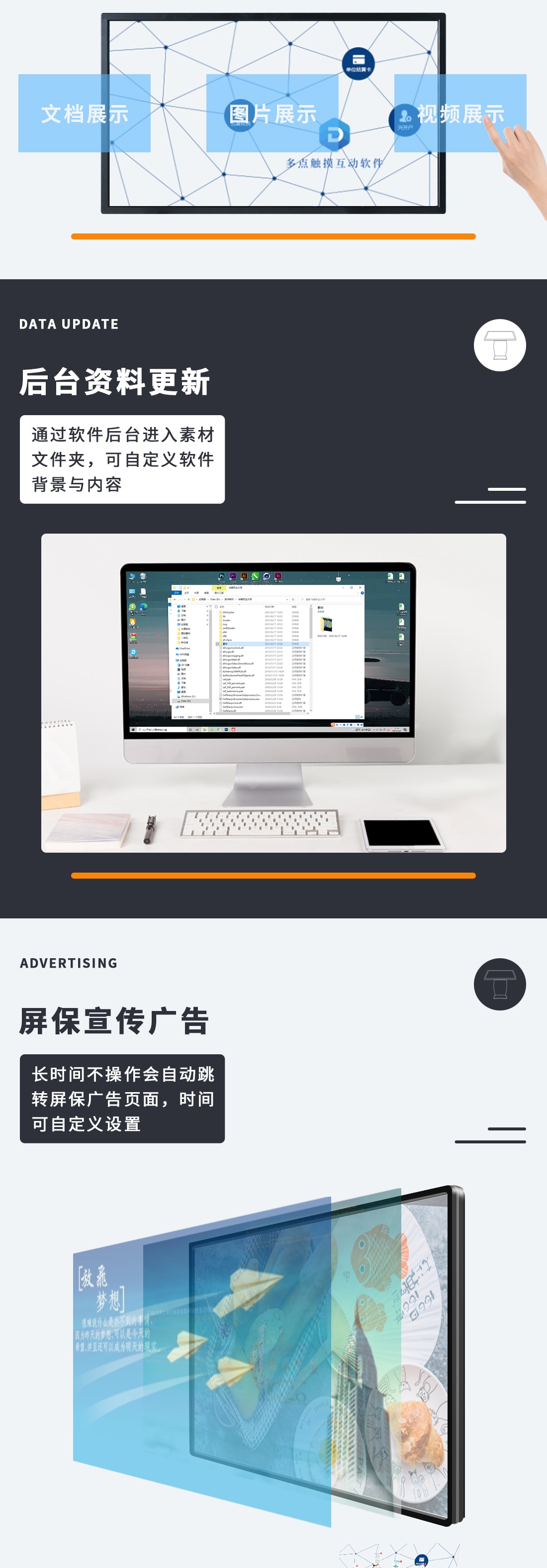 *支持开机自启、自动关机、无人触摸广告图播放、无人触摸自动返回主页、背景音乐等功能。