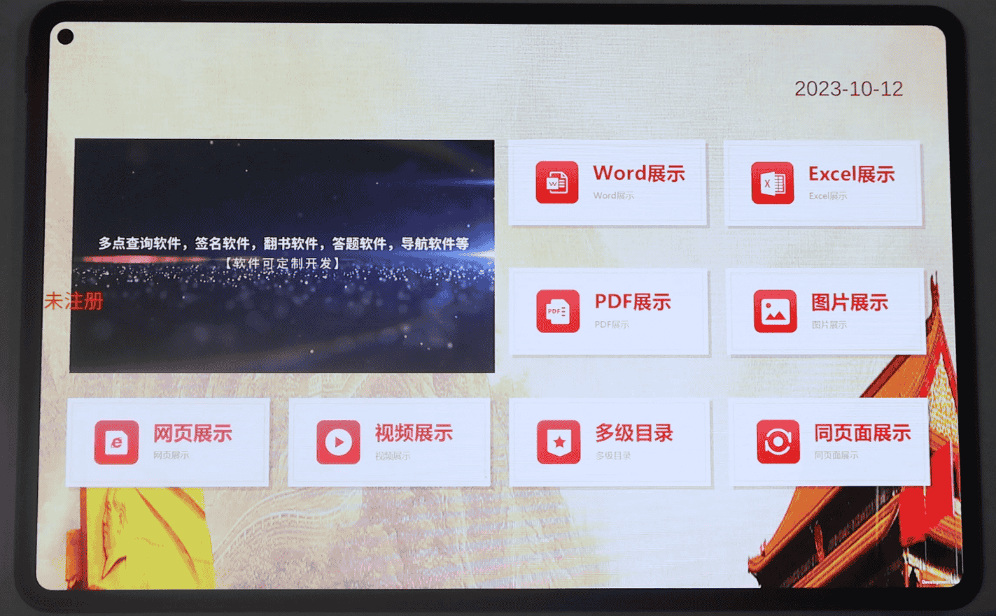*支持图片、视频、音频、天气、网页、Word、PDF、Excel等资料展示,并实现对展示资料的多点操作(通过两个手指以上进行操作),包括放大,缩小,平移,上下滑动。