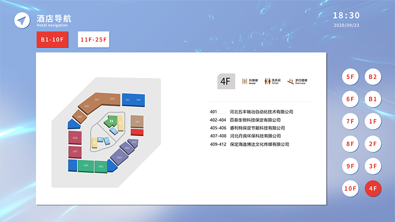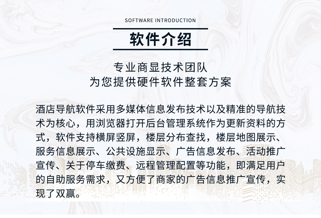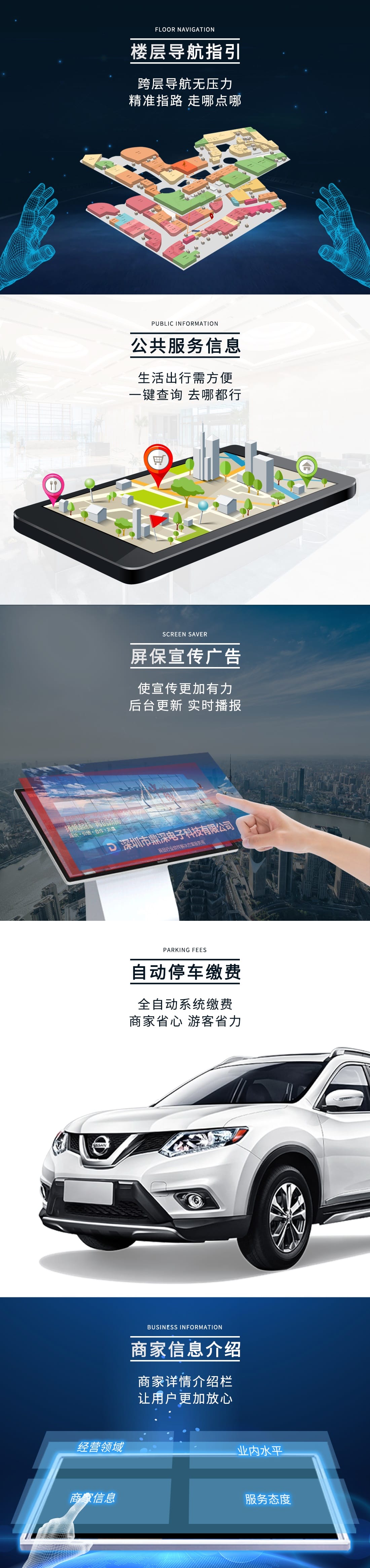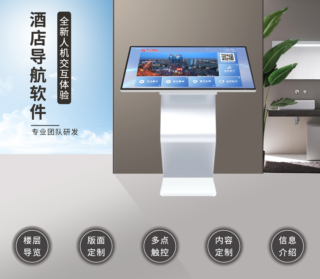 1、软件名称:导航软件-平面导航 2、硬件要求:I3 四代以上,内存4G以上,Windows系统。 3、软件功能: A、分辨率:自适应分辨率。 B、待机可自由设置全屏广告,触摸后进入导视系统主界面。 C、支持自定义楼层、店铺位置、品牌标识、公共设施。 D、支持自定义品牌优惠信息或活动,点击查看详细活动信息。 E、支持自定义商场简介、文化、发展历程、招商联系方式、周边信息等内容设置。 F、支持单机版运营,在没有网络时,也能运行。 G、资料更新:素材制作好后,可通过U盘或远程操控更新至终端机上。