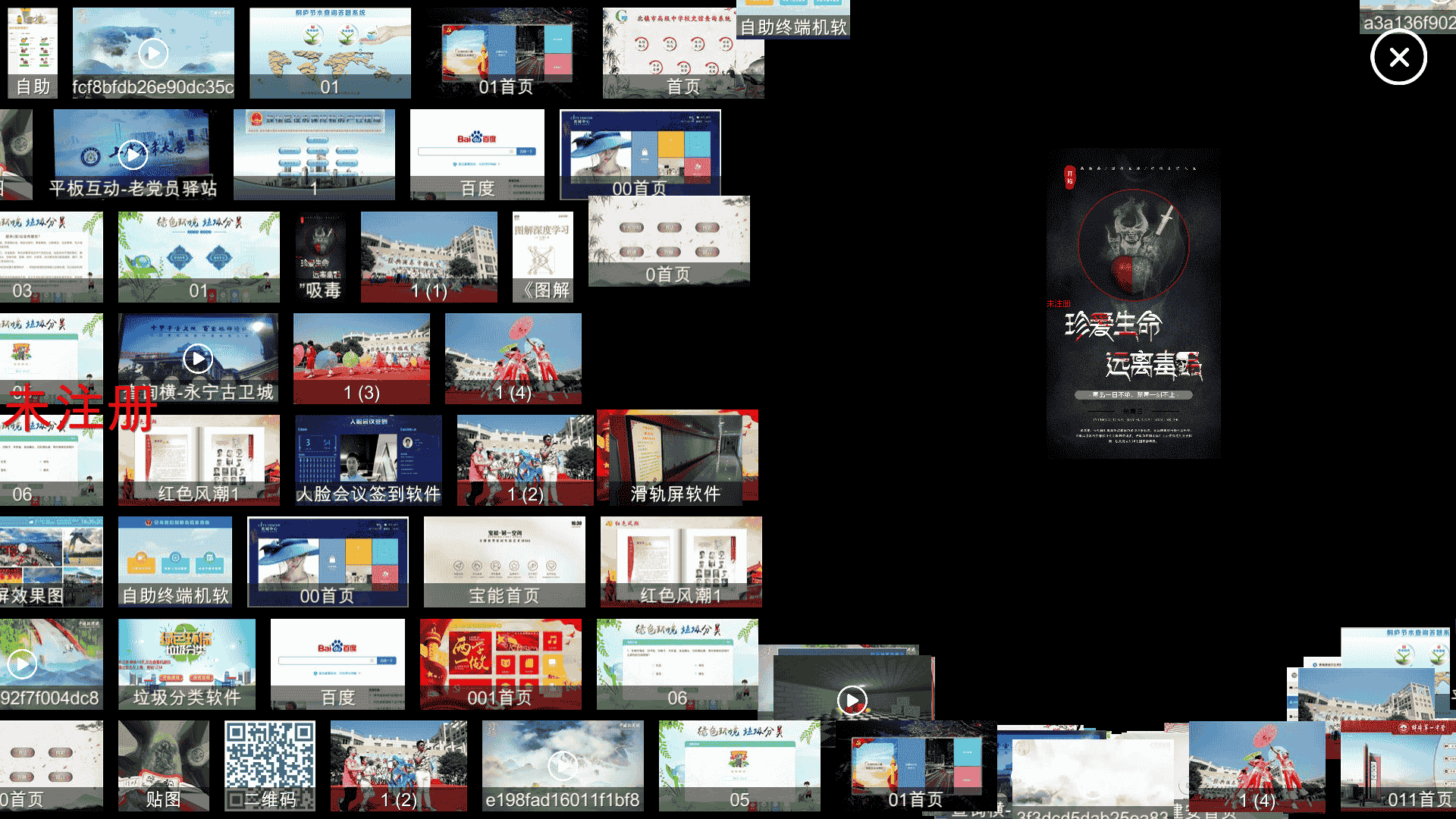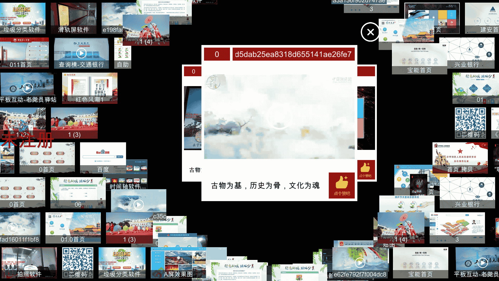 *支持可内置丰富的资源如民俗文化,书法内容,摄影作品,美术作品,戏剧作品,文化讲座,文艺表演等;展示的资源以图片,文档、视频、OBJ等多媒体形式进行展示。支持图片放大与缩小,随机动态排列,所有内容动态流向显示,支持资源更新等功能。