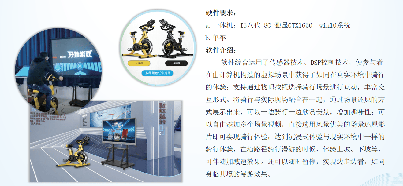 *支持通过语音控制或物理按钮选择骑行场景进行互动,丰富交互形式,将骑行与到实际现场融合在一起,通过场景还原的方式展示出来,可以一边骑行一边欣赏美景,增加趣味性。