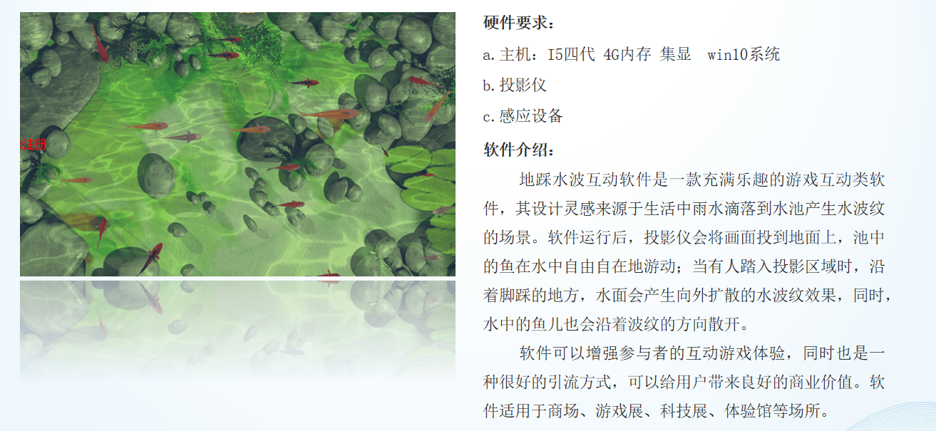*支持让当体验者走至投影区域时,通过软件识别,鱼群会随着就会随着体验者的波纹散开。